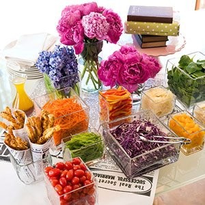 Coloque diversos ingredientes em vasilhas que você tem em casa e cada convidado monta a sua salada. Deixe diversos molhinhos de salada também a disposição dos convidados.